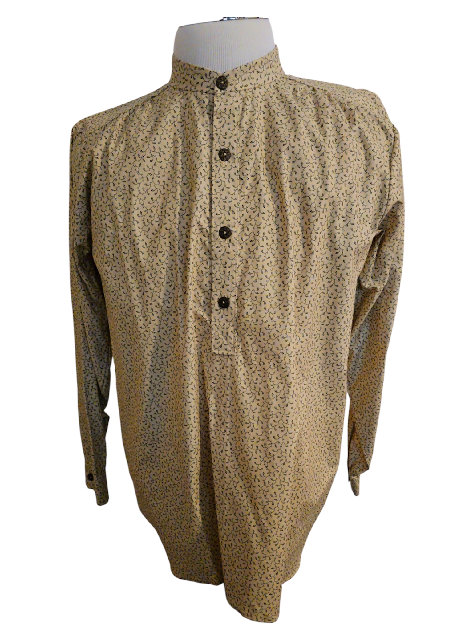 This is a gorgeous and quality cotton shirt. The buttons are antique gold tone rimmed. The fabric is gorgeous cotton in tan and brown shaded design of leaves and vines. Size is Medium.